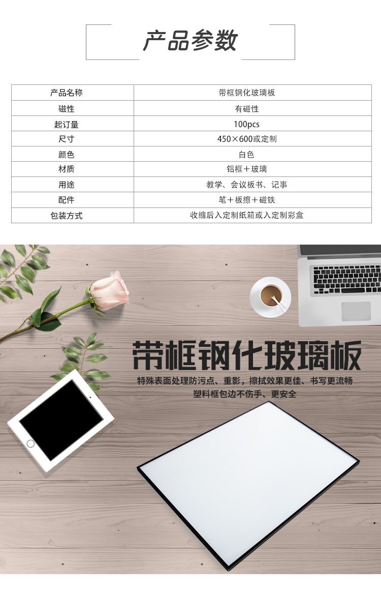 簡(jiǎn)要描述:玻璃白板是一種高端辦公用品,具有鋁合金邊框和鋼化玻璃材質(zhì)。其磁吸面板設(shè)計(jì)能夠方便用戶固定文件和便簽,使辦公更加整潔高效。這款45x60厘米的玻璃白板不僅尺寸適中,而且可以根據(jù)客戶需求進(jìn)行定制,滿足不同 ...