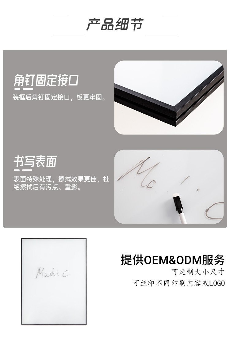玻璃白板是一種高端辦公用品,具有鋁合金邊框和鋼化玻璃材質(zhì)。其磁吸面板設(shè)計(jì)能夠方便用戶固定文件和便簽,使辦公更加整潔高效。這款45x60厘米的玻璃白板不僅尺寸適中,而且可以根據(jù)客戶需求進(jìn)行定制,滿足不同辦公環(huán)境的需求。無(wú)論是用于會(huì)議討論、寫作記錄還是創(chuàng)意涂鴉,玻璃白板都能為用戶提供優(yōu)質(zhì)的書寫和展示體驗(yàn)。